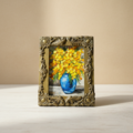 青い花瓶とのコントラストが印象的で、補色の美しさが互いを引き立て合うかのように、画面全体を瑞々しさで満たしています。背景の落ち着いたトーンが主役の色彩を際立たせることで、奥行きのある空間を生み出しています。また、アンティークライトゴールドの額縁は、この作品にさらなる気品と重厚さをプラスし、完成度の高い形で仕上がっています。