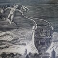天使がタイトルと紋章を掲げ教会や門・農民や牛馬・川魚や水鳥など