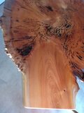 複雑に杢目がいりくんだ大きなコブ(バール)から板目が現れたた欅一枚板のテーブル天板です。