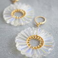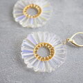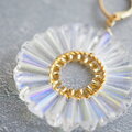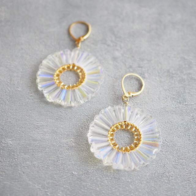 透明のガラスビーズを丸くリング状に、真ん中にはゴールドのビーズを編み付けました。タワー型のビーズは、三角錐のような形で、側面にカットが施されています。1つ1つ微妙に大きさが違ったりもするので、リング状に集めると波打つような形がフリルのように見えたり、光に反射して輝きます。