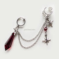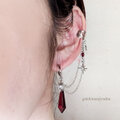 星と深い赤色の雫が揺れるフープイヤリングとビーズと星が揺れるイヤーカフを2連のチェーンで繋ぎました。