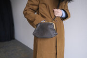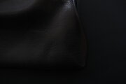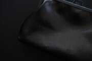 革は、作り手の高見澤さんのものづくりの特徴である、革屋さんからではなく猟師から直接仕入れるジビエ革。鳥取県若桜町で捕られた蝦夷鹿の皮を、タンニンで鞣し、染料染めしています。鹿革らしい滑らかさと柔らかさがあります。作品名は黒としていますが、少し赤みを感じる柔らかな感じの黒です。(黒の中にも色々なグラデーションがあり、革の個体差はもちろん、仕上りの狙いによって黒の中の様々な色を調整します)
