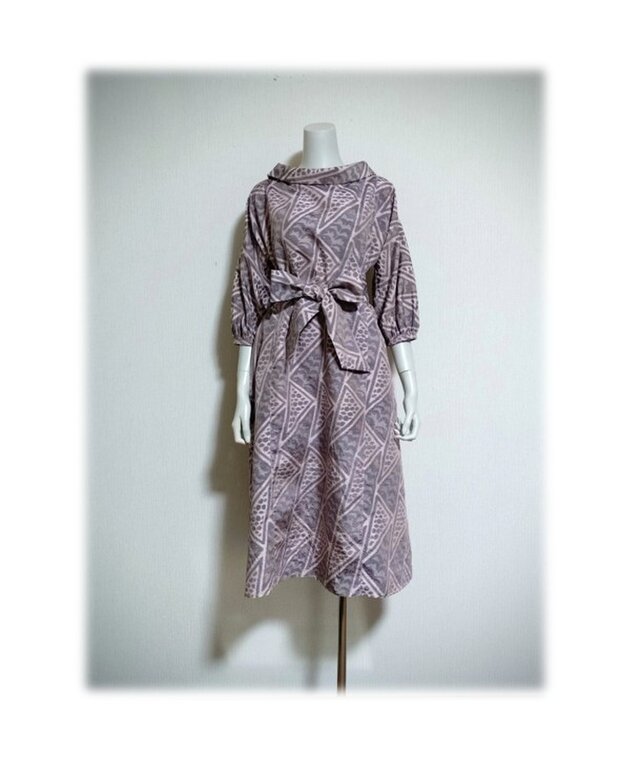 478 レトロなロールカラーワンピース 大島紬 ピンク系 三角 サッシュベルト付き 正絹