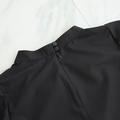 シワになりにくい素材で、少し光沢のある肌ざわりの良い滑らかな素材です。ネック部分のギャザー、袖のフリルが上品に、後ろはジップと1つボタン。