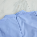 シワになりにくい素材で、少し光沢のある肌ざわりの良い滑らかな素材です。ネック部分のギャザー、袖のフリルが上品に、後ろはジップと1つボタン。
