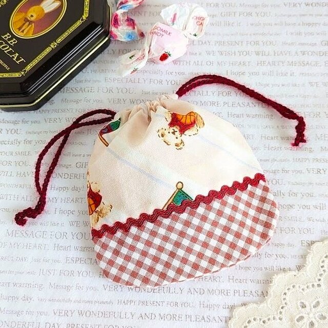 #くま #クマ #テディベア #動物 #バスケットボール #ストライプ #かわいい #ピンク #赤 #ほっこり #チェック #小物入れ #巾着袋