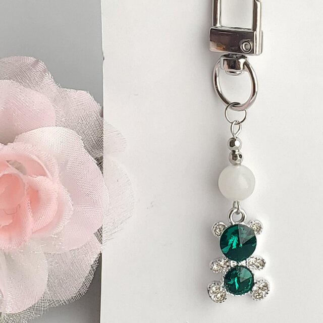深いエメラルドグリーンが輝く熊チャームに優しい月の光を宿すムーンストーンを合わせた上品で可愛らしいキーホルダーです。