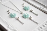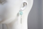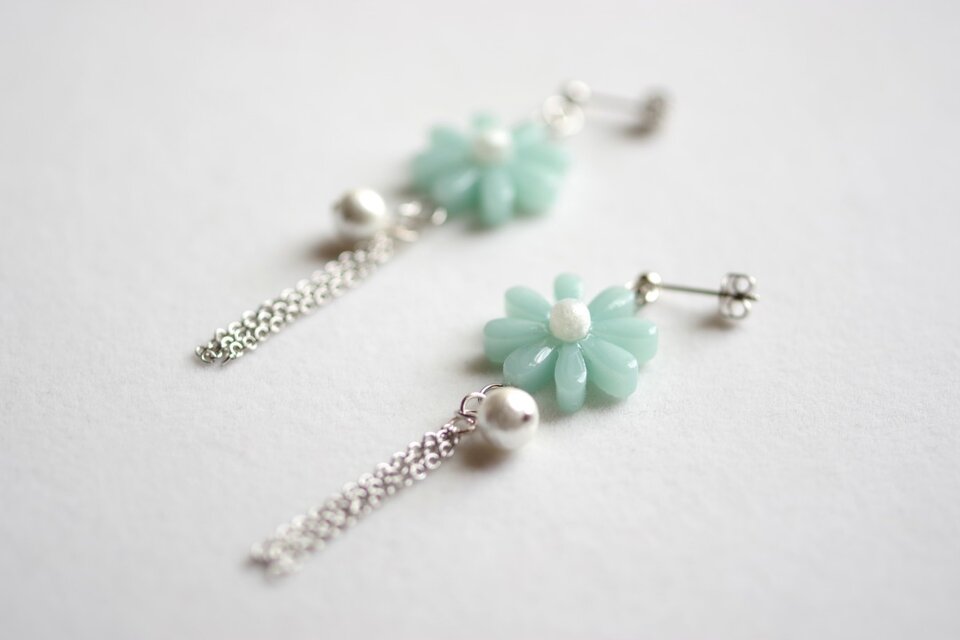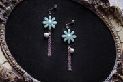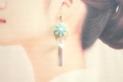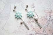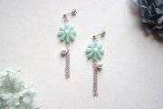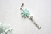 緑味を帯びた優しく淡い水色のお花に、コットンパール一粒とフリンジを添えました。