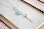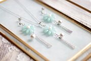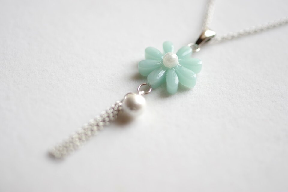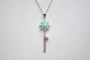 緑味を帯びた優しく淡い水色のお花に、コットンパール一粒とフリンジを添えました。