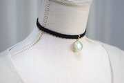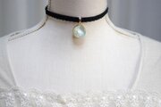 春の初め、冬枯れの地面から若草が芽吹く景色をイメージしたレジンを、ベルベットリボンにタティングレースで装飾を施したチョーカーに仕上げました。