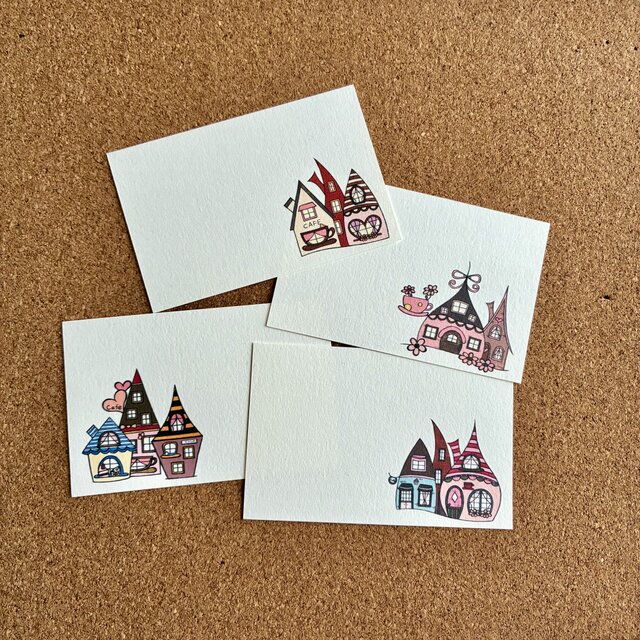 カフェをイメージして描いたイラスト4種、マットな感じの色味のメッセージカードです。
