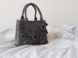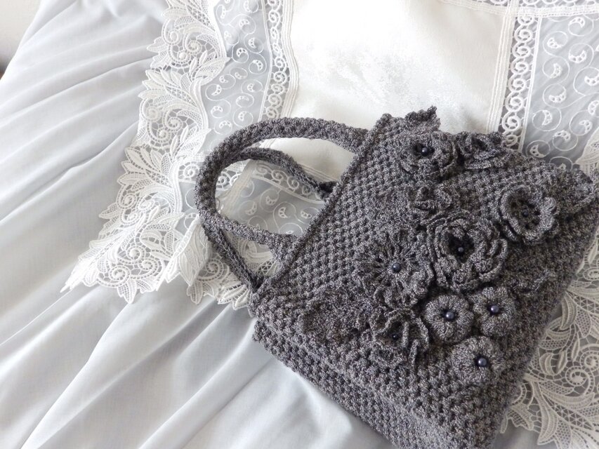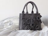 同じ糸で花のモチーフを編んで飾り、小さくても存在感がありアクセサリー感覚で持っていただけます。