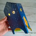 シンプルな家型のデザインに窓や扉、階段などのパーツを鏤め、ぬくもりのある