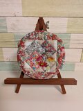 手のひらに乗るほどの大きさのまんまるポーチです。表には、小さいパッチワークのパターンをぎゅっと閉じ込めました。