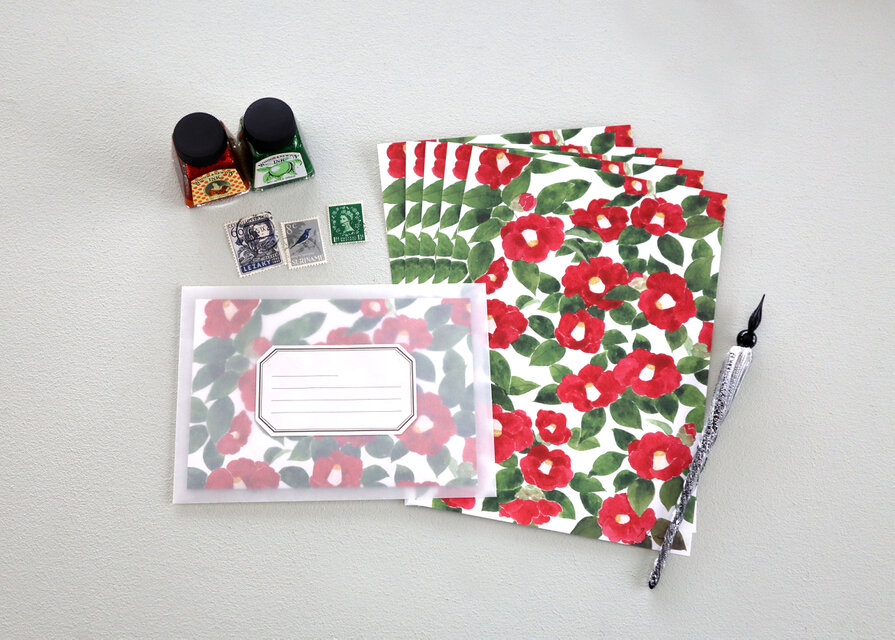 透明水彩で描いた椿のレターセットです。