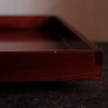 縁と盆面の繋ぎ目に木地と漆の収縮差によって生じる漆ビビや微々たる隙間など生じておりますがこの手の盆にはよく見られれる現象で、しっかりとした造りなので普通のご使用には問題ございません。