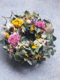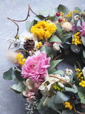 ユーカリ(5種)、ミモザ、スターチス(4種)、ラナンキュラス(2種)、ミツマタ、サンキライの実、メタセコイアの実、HBスターチス、花かんざし、ラグラス、アジサイ、ユーカリベリー、アオツヅラフジのツル、センニチコウ