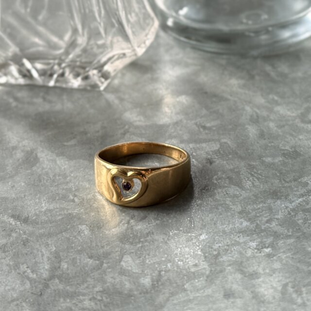 オープンハートと中央にルビーレッドのラインストーンが煌めくゴールドトーンリング。