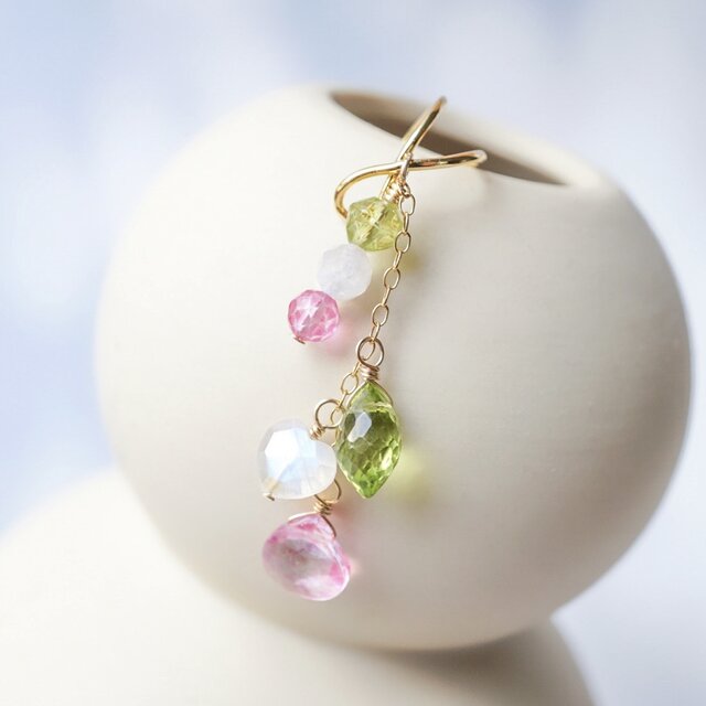 「花より団子」天然石 イヤーカフ 片耳 誕生石 春 和菓子 三色団子 ペリドット ムーンストーン ピンクトパーズ ギフト