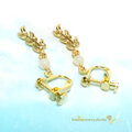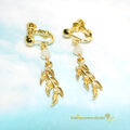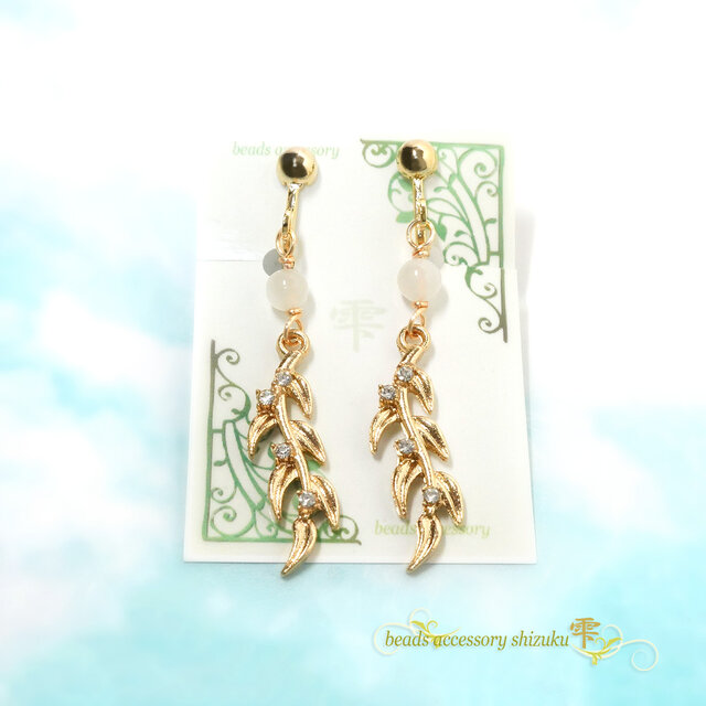 シラーが美しく浮かび上がるホワイトムーンストーンに、ガラスストーンをあしらったロングリーフを合わせたイヤリングです。