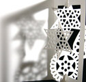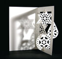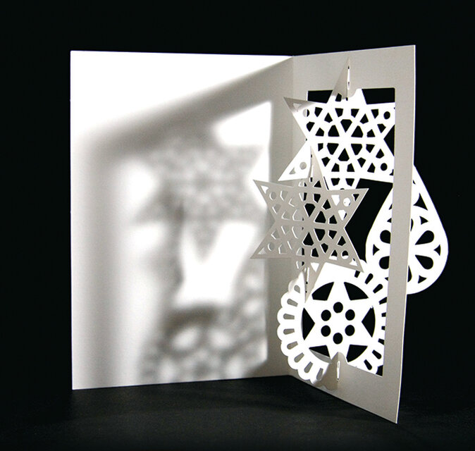 カードを開くと、宝石をイメージしたモチーフが現れます。 立体部分がモビールのように、室内の微妙な風の動きに反応してゆっくりと動きます。