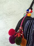 ハンドルは1本の紐から、民族的な装飾がバッグのチャームのように見えるよう結んで持ち手にしてみました。