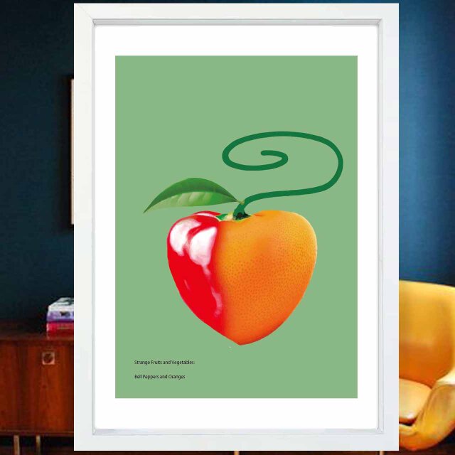 ハートフルなフルーツ? いや野菜? 左がピーマン 右がオレンジおかしなポスター。