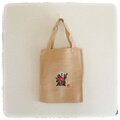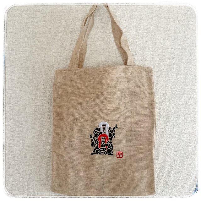 落ち着いた生成りカラーのジュートトートバッグに、印象的な和テイスト刺繍を施した一点。