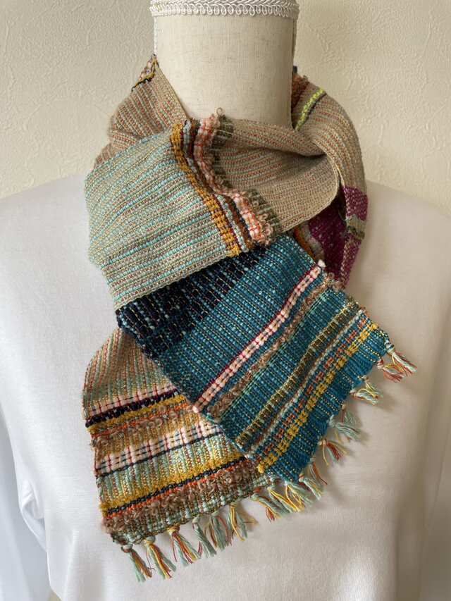 ベージュのウール糸と、水色のリネン糸で、春っぽいモヤモヤとフワフワな空気を感じながら織りました。