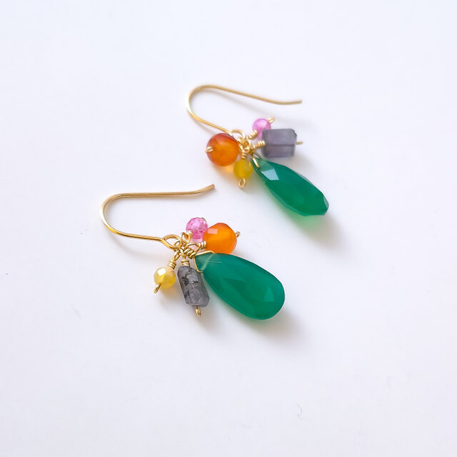14KGF グリーンオニキスとカラフル天然石の小さめピアス イヤリング