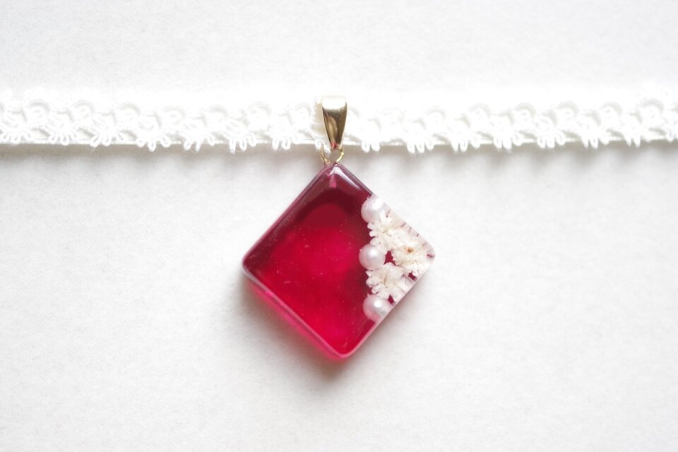 パールとお花をスクエア型に封じ込めピンクで着色したレジンを、サテンリボンにタティングレースで装飾を施したチョーカーに仕上げました。
