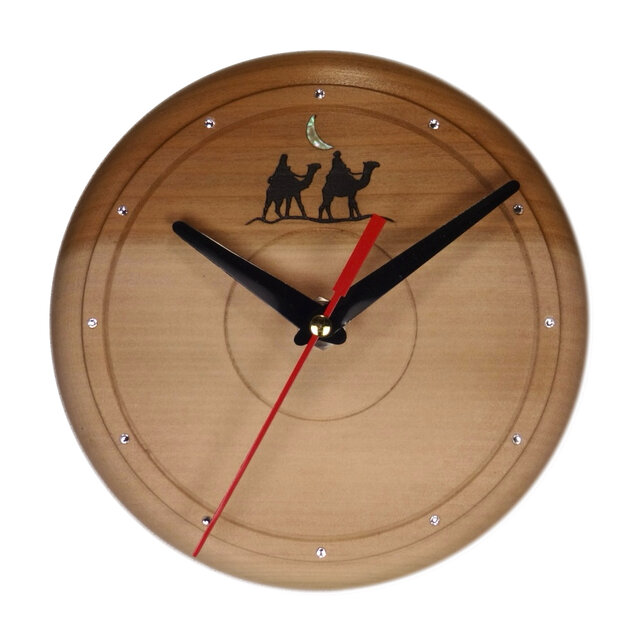 桂の無垢材に、月の砂漠をテーマにしたラクダの焼絵、さらにアワビの螺鈿による月がきらりと光る――「月の砂漠」の情景を閉じ込めた一点物の時計です。素朴な木の温もりと幻想的な輝きが調和し、眺めるたびに物語が広がります。和室にも洋室にも馴染み、上質な存在感を放つインテリアとして贈り物にも最適です。