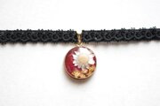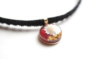 深いボルドーの背景に大胆にお花一輪を咲かせ、金箔を添えた豪奢な印象のレジンを、ベルベットリボンにタティングレースで装飾を施したチョーカーに仕上げました。