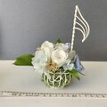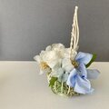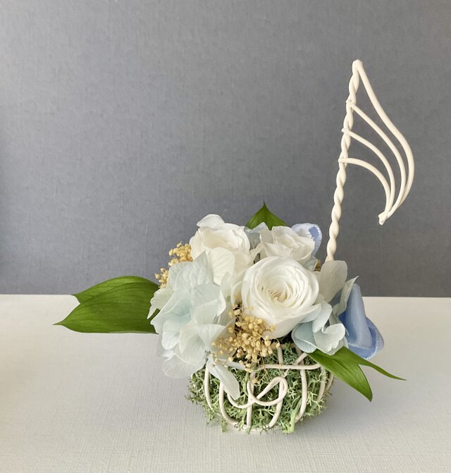 プリザーブドのバラの花を 白いワイヤーの音符のカゴにアレンジしました。