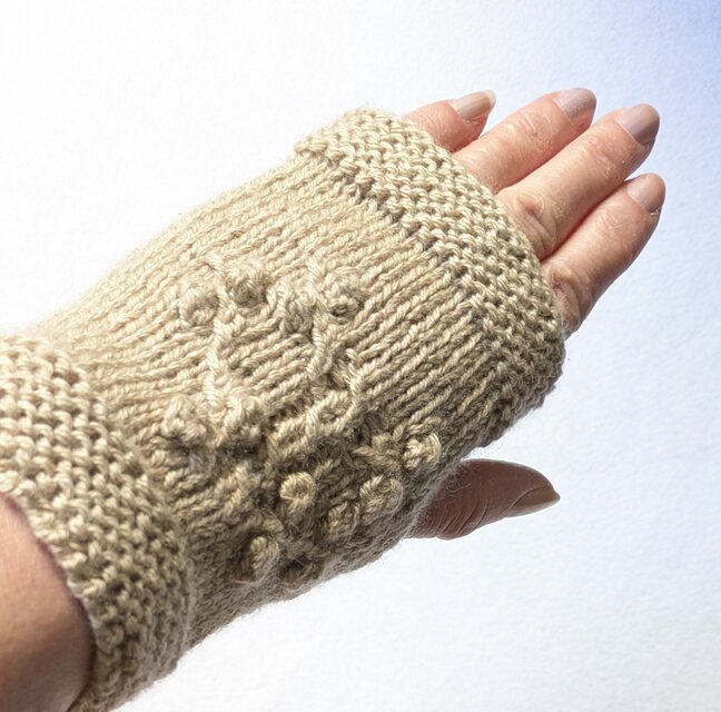 冬以外でも重宝する上質で軽い、シルクウールの手編み指なしハンドウォーマーです。