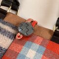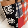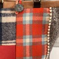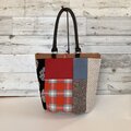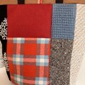 赤い毛布のようなチェックをメインにツィードや刺繍生地を合わせました。
