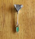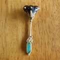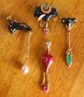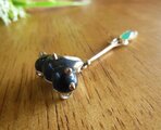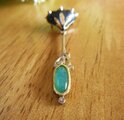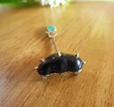 アートなジュエリーをと制作しました。赤銅(銅と金の合金)を打ち出し技法により本体を作り、赤銅の漆黒に映える18Kイエローゴールドが合わせてあります。揺れる芯棒は18Kピンクゴールドで、ブルーオパールの石座は24Kで作り、メレダイヤがセットしてあります。この作品はジュエリーデザインアワード2010に出展させていただいたシリーズの一つです。