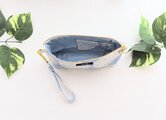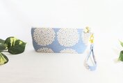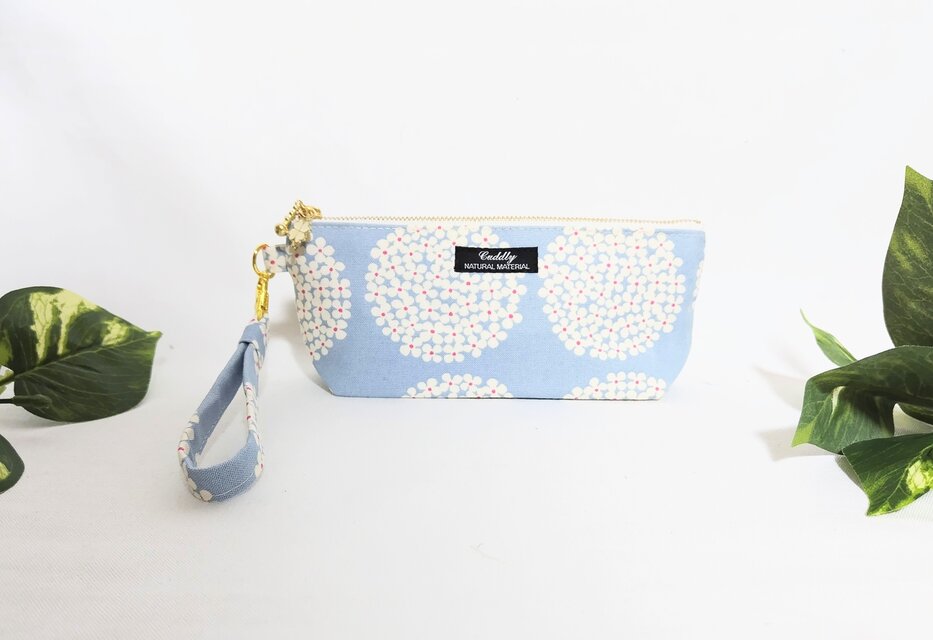 北欧柄サークルフラワーのサックスブルー色、綿オックス地のちょっと大きめサイズの持ち手付きペンケースです。