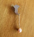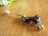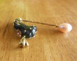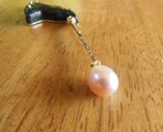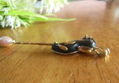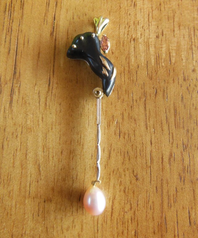 作成し、赤銅の漆黒に映える18Kイエローゴールドを合わせ、インペリアルトパーズ(マーキースカット)がセットしてあります。芯棒は18Kピンクゴールドで先端にピンクのコスイパールをつけてます。芯棒は滑車で左右に振れます。この作品はジュエリーデザインアワード2010に出展したシリーズのひとつです。