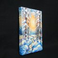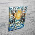 本作品の特筆すべきポイントは、油彩ならではの厚塗り技法による重厚感と立体感です。太陽の光は、ただの色に留まらず、見る者にその熱が伝わってくるかのような力強さを持っています。この光が雪に反射し、冷たい白や青の景色に暖かなニュアンスを添え、全体の調和を生み出しています。また、雪を頂いた木立の描写は見事で、白く積もった雪が生き物のように枝を覆い、その背後には光の粒子がさりげなく散りばめられています。