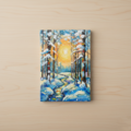 森に続く小川の流れは、光を反射しながら蛇行し、静止した冬の風景の中に生命の躍動感を与えています。冷たい寒色と情熱的な暖色のコントラストが、冬という季節の美しさを際立たせ、厳しい冬の先に必ず訪れる春の兆しを予感させる作品です。