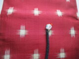 中綿を入れ、正絹の藍大島紬で作ったループを付け、ループの先にトンボ玉と山サンゴを付けています。
