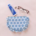 【受注制作】リトアニアリネンのフリルポーチ 20cmファスナー フラットポーチ マーガレット 花柄 ギフト 上品 ブルー 春