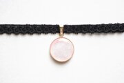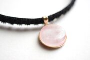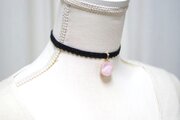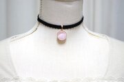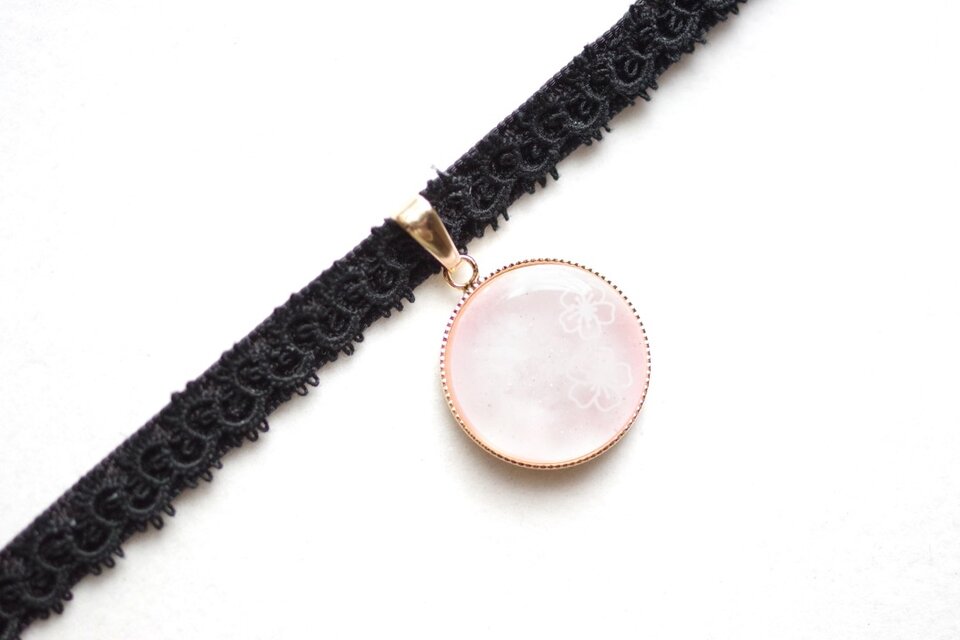 淡いピンク色が優しくうららかな、春を思わせるカラーリングのレジンを、ベルベットリボンにタティングレースで装飾を施したチョーカーに仕上げました。