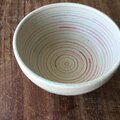 内も外も赤色と桃色のシマシマ模様を描いたお茶碗です