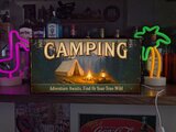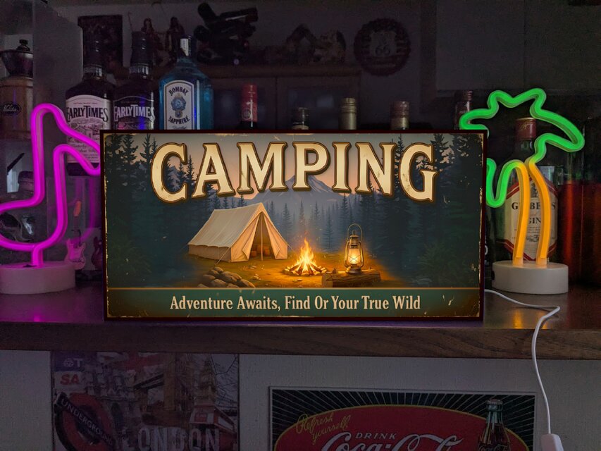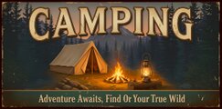 キャンプをテーマにした看板、焚き火とテントのイラスト付き。