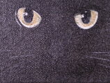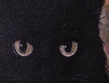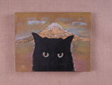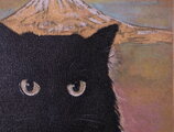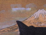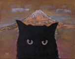 新色に染まる富士山を背景にこちらを見ている黒猫。シンメトリックな構成は落ち着きと安定感、そして黒猫の見つめるまっすぐな瞳は凛とした緊張感を持っています。