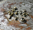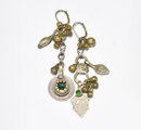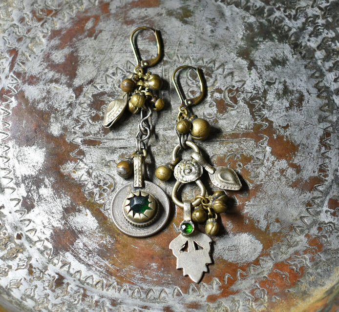 葉っぱの様な形状にグリーンの装飾が施されたパーツ、チェーン、大小の鈴、くにゃっと曲がった平たいパーツ、少しぷっくりとした、ペイズリーの様なパーツは、アフガニスタンから届いたものです。