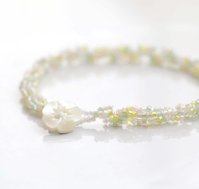 色とりどりの小さな国産ビーズを一粒一粒、色合わせをしながら編み上げたビーズブレスレットです。