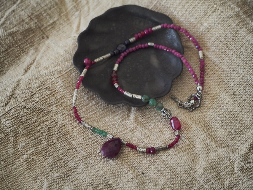 ルビー、エメラルド、サファイア、王者の石たちを集め、そしてカレン族のシルバーをふんだんに使って制作したネックレスです。